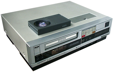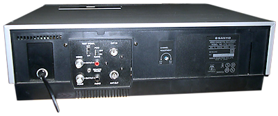 On the rear of the machine, there is a PCM switch, this is used to bypass the drop out compensator circuitry on the unit for when it is connected to a PCM digital audio device such as the PCM-701. See also the glossary entry for more information on this excellent feature. There is also a "remote pause" connector that are often used in duplicator banks to synchronise recordings. The clock can be toggled between display the time and a tape counter, there is also a memory / reset feature to compliment this. There are also cassette and dew indicators on the front left, the dew indicator being quite common on Sanyo models and did have a habit of being overly cautious and shutting the unit down. The tuner features 12 presets which can be configured on top of the unit. The timer can only be programmed for a single 8 day event. Record can be started by pressing REC and Play together. A wireless remote control was also available. Being an entry level machine, the unit does not feature camera input, audio dubbing or time remaining features.