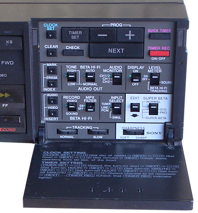 Another unique feature of the video is the ability to perform video insert editing which together with audio insert made the deck ideal for video editing. It was also the only Betamax machine to come with a SCART ( Peritel ) socket. The front panel boats controls for trick speed modes. However, because the 950 uses a single reel motor with pendulum drive these are not as responsive as those on the SL-C9. Like the C9 it has a real-time tape counter and multi-event timer. Opening the flap reveals a whole set of controls for video and audio dubbing, monitoring etc etc.
