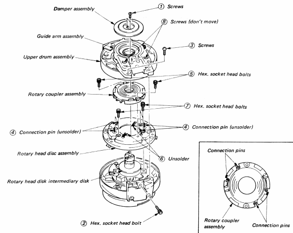 - Refit the four connection pins to the rotary head disk assembly.
