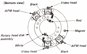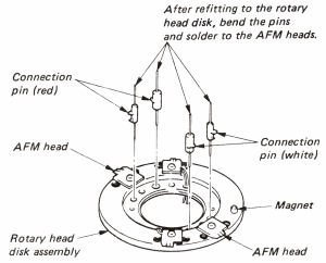 - Solder the four leads to the video head of the rotary head disk assembly. (Caution on correct orientation of the magnet.) Thread the leads through the holes.