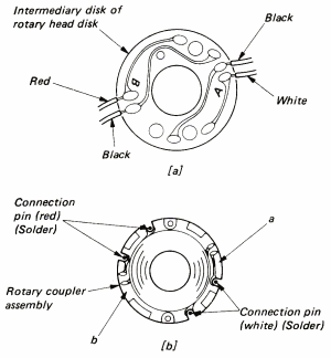 - Unsolder the red, white and black leads at four positions from the intermediary disk of the rotary head disk.