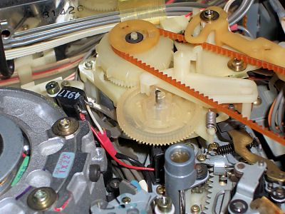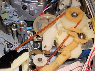Failure to load a tapeThe cassette carriage can fail to operate. This is caused by breakage of the plastic gears in the side of the mechanism. Often one of the teeth is missing.When this happens the faulty gears must be replaced and the mechanism correctly realigned so that the left and right side "tray arms" are at the same position relative to the front panel. This is done by releasing the plastic tab on the gear away from the motor side and selecting the correct mesh position with the teeth of the drive cog on rod which connects between both sides of the cassette tray. |