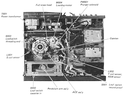 No head rotationYou may find that the head drum fails to rotate. This is due to a problem with the Hall effect device on the head drum motor which is secured by a blob of glue. Full details on how to fix this can be found on the head motor page. |