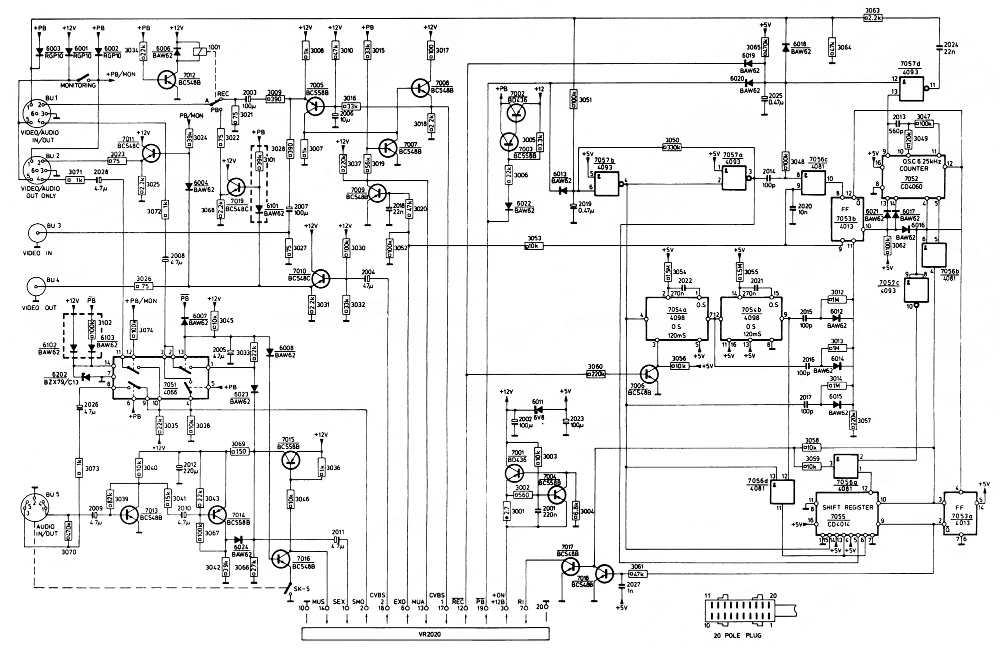 During playback operation a low signal PB is applied to pin 19 of the 20-pole connector. Through diode 6022 transistors 7003 and 7002 are then turned on and the switching signal +PB and PB1 is supplied to the collector of transistor 7002. This switching signal sets Relay 1001 and the electronic switches in IC7051 (4066) controlled by pins 5, 6 and 12 to Playback mode. Pin 13 of IC7051 is held low by diode 6007.The video output signal from the VCR appears on Pin 18 of the 20-pin connector and is applied, with appropriate biasing, to the base of transistor 7010. From this transistor this signal is transferred to BU4 and through transistor 7011 to BU2. It is also sent via relay contact to BU l, pin 2.