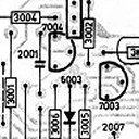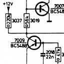 The adapter is powered with 12 Vd.c. from the VCR. This voltage enters at point 3 of the 20-pole connector. The circuit around transistors 7001 and 7004 provides current limitation at 400 mA.Operation