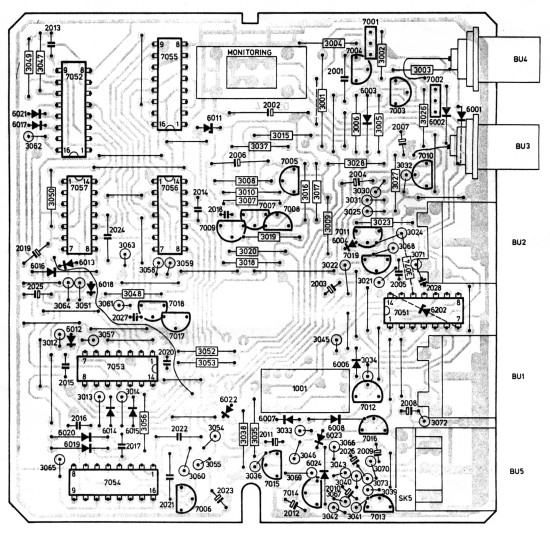The audio signal on BU1 gies to Pin 2 of IC7051. As Pin 13 is pulled high via R3045, the electronic switch is closed and the signal from Pin 1 is applied to the VCR via diode 6023 and C2011 and pin 1 of the 20-pole connector. If a microphone is used for recording switch SK5 is closed and transistors 7016 and 7015 are then turned on and the amplifier comprising transistors 7013 and 7014 receives the power supply voltage. Through diode 6024 and C2011 the amplified audio signal is applied to the VCR input. Because the emitter of transistor 7016 is connected to earth via SK5, the voltage on Pin 13 of 1C7051 becomes low and the audio signal from BU1 is disconnected.